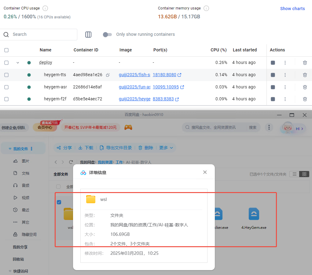 上面是本人亲自测试可用的heygem整合包,文件一共120G左右,无需科学上网,用百度网盘直接下载。其中wsl文件夹是官方文档推荐的安装方式安装后产生的虚拟化文件,你只需要按照官方步骤安装好wsl和docker,然后用wsl文件夹里文件覆盖你的项目即可一键启动。 【该服务9.9元,加微信获取提取码】